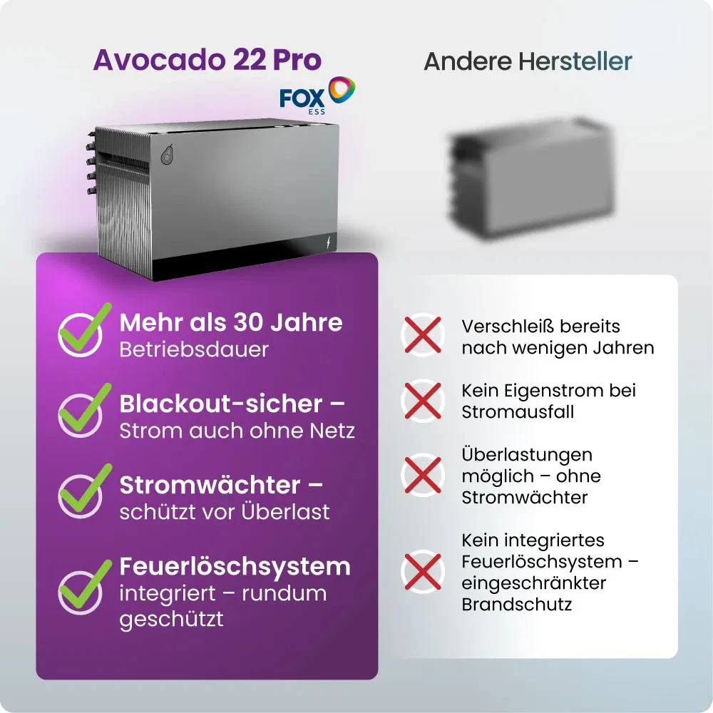 Der FoxESS Avocado 22 Pro-M ist ein kompakter, leistungsstarker Stromspeicher speziell für Balkonkraftwerke. Mit 2 kWh Speicherkapazität, 4 integrierten MPP-Trackern und Notstromfunktion ermöglicht er maximale Eigenverbrauchsoptimierung auch bei komplexeren Modulkonfigurationen.